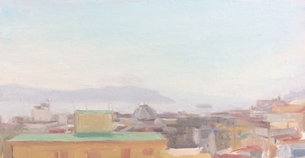 I've finished my 'dark period for now, but I may go back to it! I'm not particularly pleased with this painting. It's on a blue ground for a change, and I did a preparatory drawing. I've experimented with a new signature on this one too! It's oil on board 6 x 6 inches.
